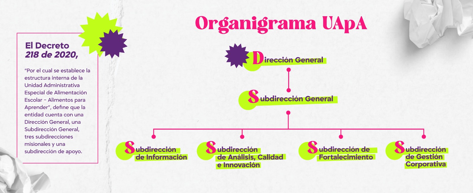 La Unidad Administrativa Especial de Alimentación Escolar – Alimentos para Aprender (UApA), inicia operación a partir de la expedición de los decretos 218 y 219 de 2020, como entidad adscrita al Ministerio de Educación Nacional.