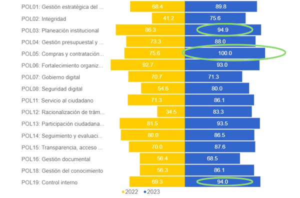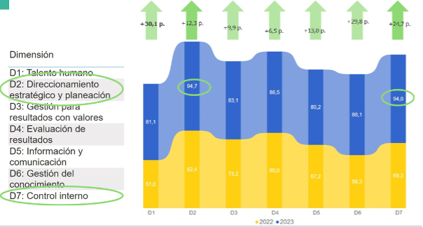 - Direccionamiento Estratégico y Planeación: Obtuvo 94,7 puntos, con un incremento de 12,3 puntos. Esto indica una mejora significativa en la dirección de la entidad.
