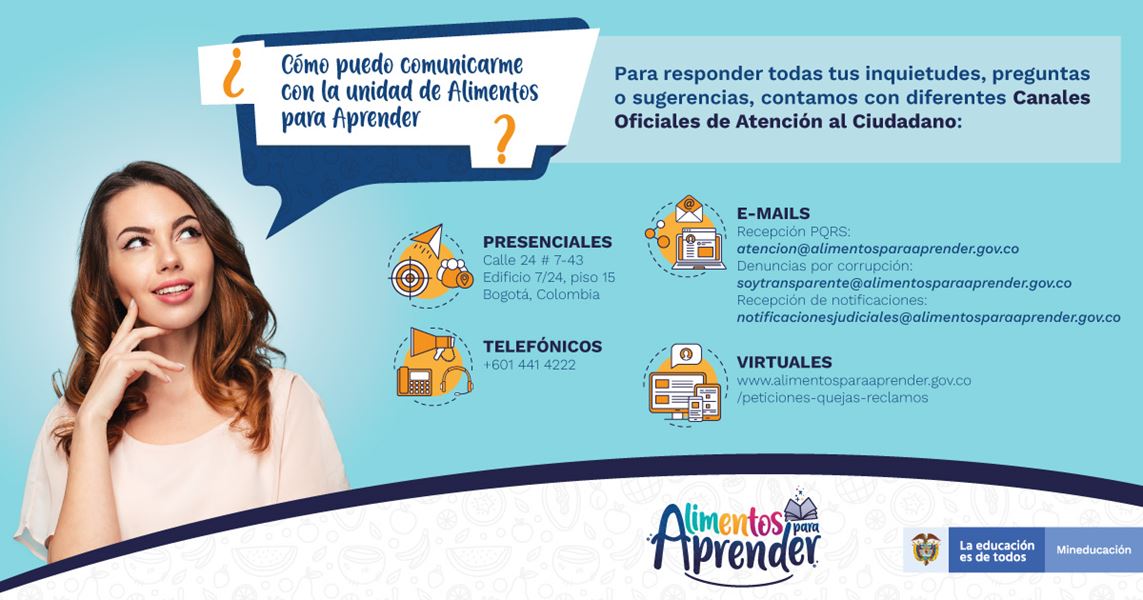 - Virtual: PQRSD atencion@alimentosparaaprender.gov.co ; Transparencia soytransparente@alimentosparaaprender.gov.co ; Notificaciones notificacionesjudiciales@alimentosparaaprender.gov.co